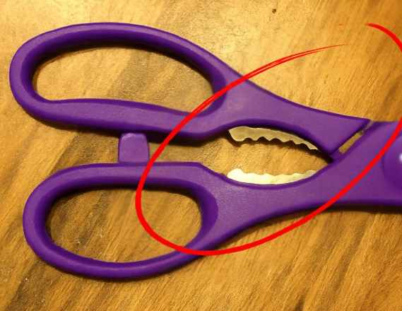 Zauważyłeś kiedyś ten postrzępiony, ząbkowany fragment ukryty między uchwytami nożyczek kuchennych — tuż za miejscem, gdzie trzymasz palce?