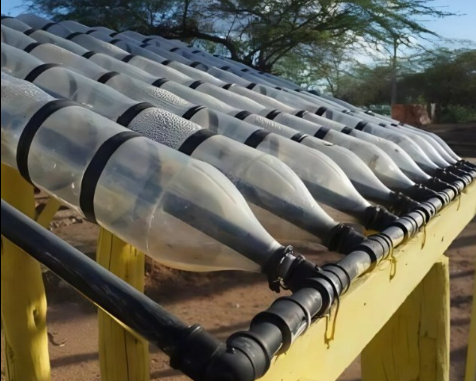 Słońce nagrzewa wodę, gdy ta krąży przez butelki, a zanim trafi do domu, jest już ciepła. Dzięki temu w cieplejszych miesiącach ma darmową ciepłą wodę! Oczywiście zimą takie rozwiązanie się nie sprawdza, ponieważ woda mogłaby zamarznąć.